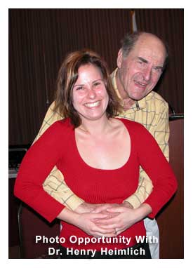 Report on the Advanced Study Weekend with Dr. Heimlich Many people attending the weekend considered the experience to be almost mystical – an experience never to be forgotten – the experience of being in the presence of and listening to the inspiring words of Dr. Henry Heimlich – the man who has saved more lives than anyone else in human history. He described his on-going struggles with the American Red Cross and the American Heart Association. They have resisted teaching the public the Hemlich Maneuver for aiding choking victims. They stubbornly teach the “back slap” – a procedure that actually drives the lodged food deeper into a choking person’s windpipe – sometimes killing the victim. Similar resistance from these organizations is also seen for drowning victims. They teach mouth-to-mouth, which cannot work when a person’s lungs are filled with water. Instead, the Heimlich Maneuver will force the water out of the lungs and save a life. You need to learn this procedure in case of an emergency. For instruction and more information see: http://www.heimlichinstitute.org/maneuver.html. To preserve the memory of this event, all